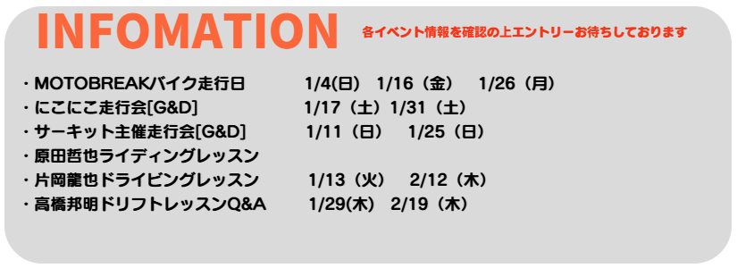 | 1月4日(日) | カート&バイク | MOTOBREAK | 貸切のみ利用可能 |